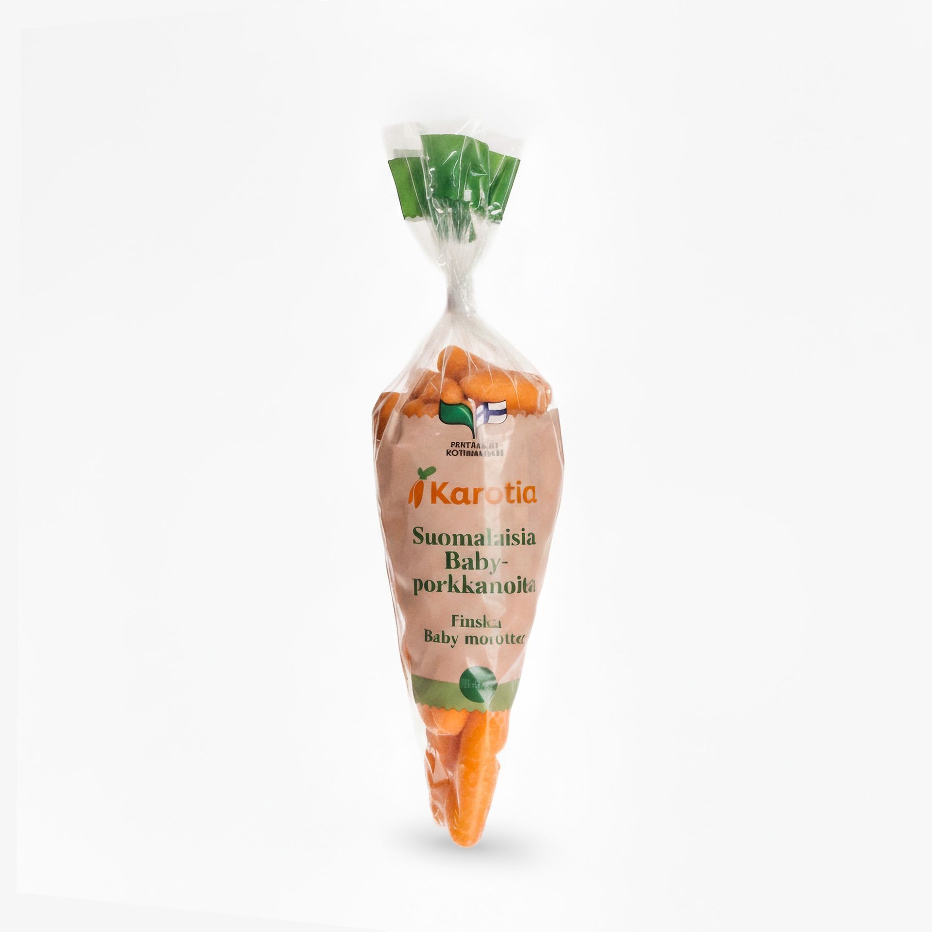 Baby-porkkanamme ovat nousseet suureen suosioon maanlaajuisesti. Sopivan pieni porkkana on erinomainen vaihtoehto terveelliseksi välipalaksi ja naposteluun. Kartion malliseen pussiin pakatut pikkuporkkanat sopivat mainiosta reppuun, laukkuun tai vaikkapa salkkuun. Baby-porkkanamme on valittu muun muassa vuoden elintarvikkeeksi ja tuote on huomioitu painonvartijoiden tunnustuksella.